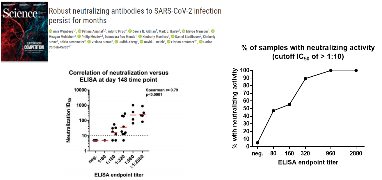 实验室(Mount Sinai Laboratory)试剂盒在《科学》杂志的结果指出:SARS-CoV-2感染可诱导稳定的中和抗体,至少数月