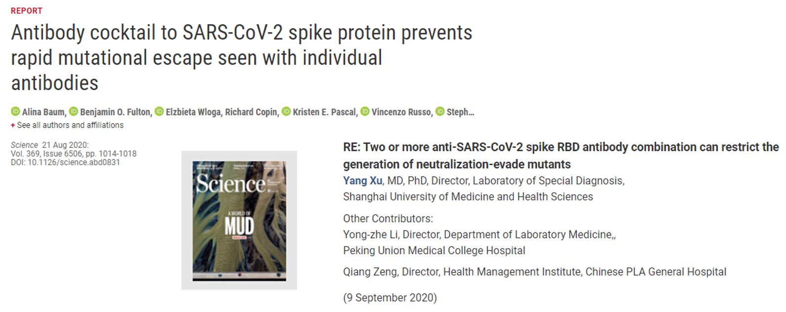 2020年9月9日,全球免疫力监控联盟秘书长、亚洲总监许洋博士团队在《科学》杂志上发表了关于抗体鸡尾酒疗法在控制新冠肺炎发生发展中的重要性的评论。研究所探寻的这两种抗体,是美国前特朗普总统于2020年10月2日感染新冠病毒后用于靶向治疗的,且治疗其效果是显著的。