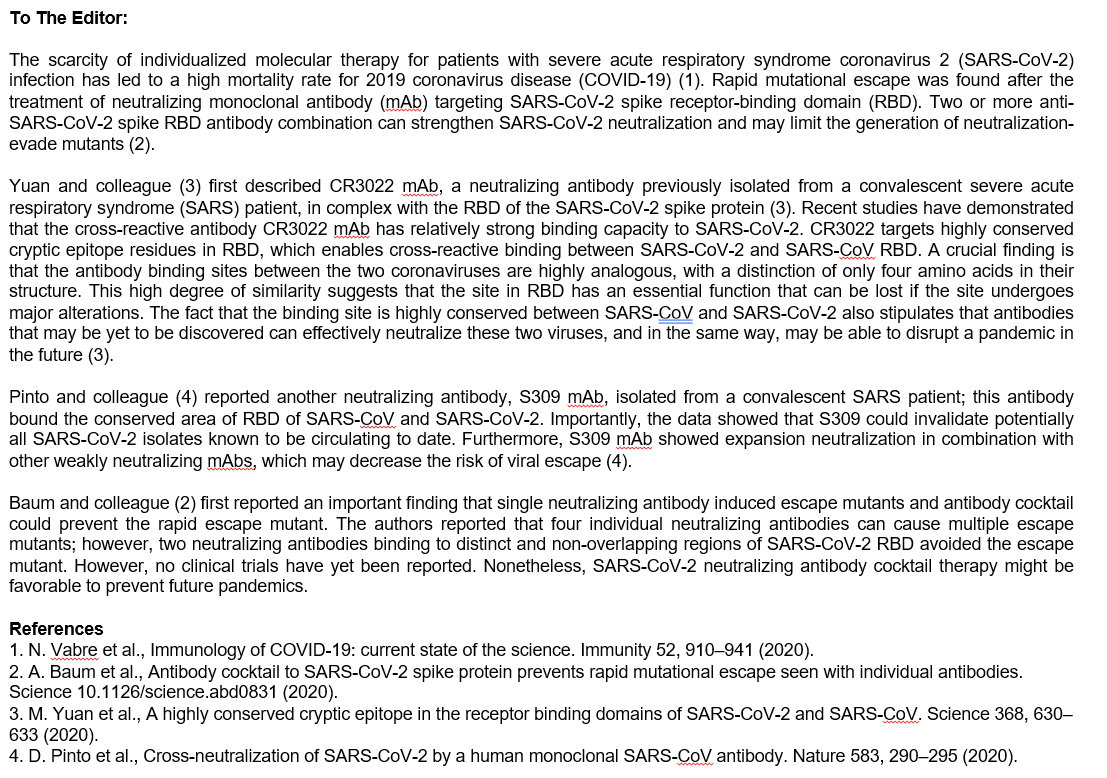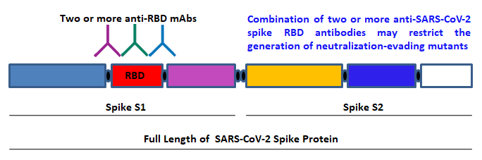 因此,两种或两种以上抗SARS-CoV-2 spike RBD抗体或针对RBD的“鸡尾酒抗体”的亚型的组合可能会增强治疗效果。