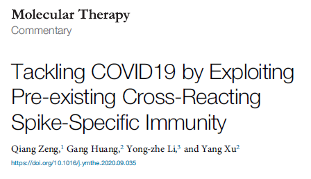Zeng, Q., Huang, G., Li, Y. Z., & Xu, Y. (2020). Tackling COVID19 by Exploiting Pre-existing Cross-Reacting Spike-Specific Immunity. Molecular Therapy, 28(11).