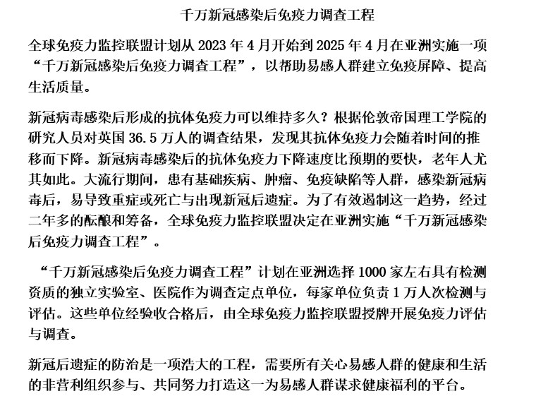 全球免疫力监控联盟计划从2023年4月开始到2025年4月在亚洲实施一项“千万新冠感染后免疫力调查工程”,以帮助易感人群建立免疫屏障、提高生活质量。