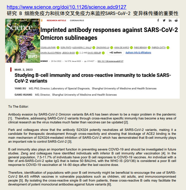 联盟成员单位在《科学》杂志上发表“研究 B 细胞免疫力和抗体交叉免疫力来监控SARS-CoV-2 变异株传播的重要性”的评论